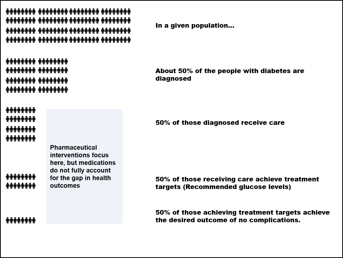 The Rule of Halves Theoretical model is a quantitative measure of diabetes care in a given country. The pattern shown here is the starting hypothesis but varies from country to other. E.g. in Copenhagen, 74% are diagnosed and among those who are, 90% receive care, and out of those, 40%–60% have achieved target levels of treatment. Adapted from Napier et al. (2017)